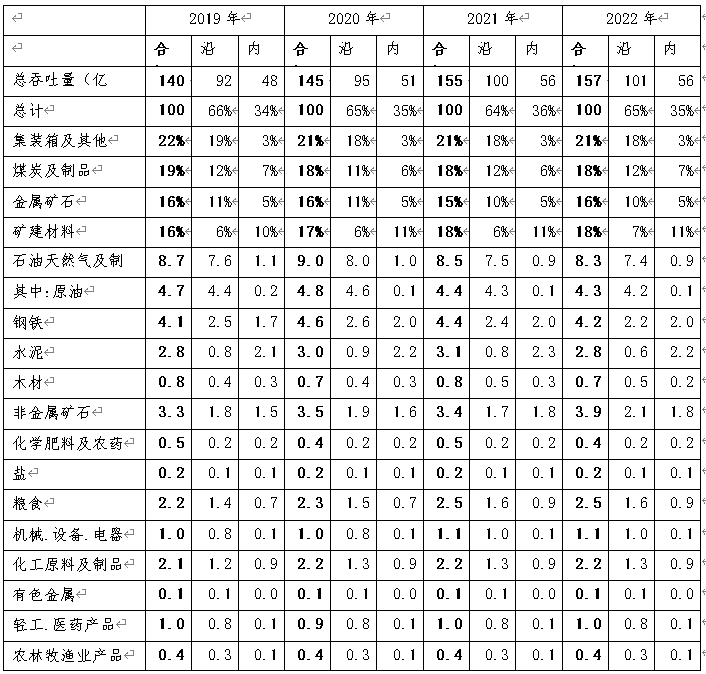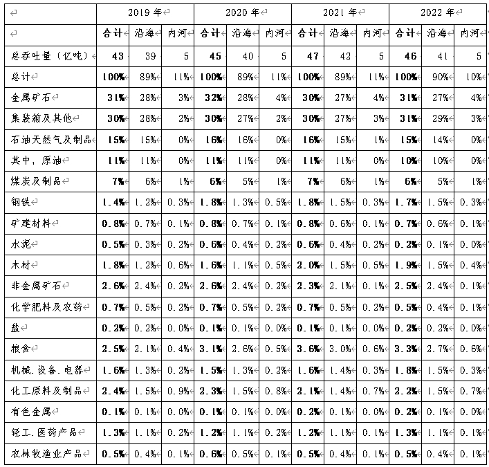 2022年中国港口共外贸货物46亿吨,主要由沿海港口完成。货物结构上,金属矿石、集装箱、油气分别大约占比31%、30%、15%,合计占比约为76%,是中国主要的外贸货物。不同货物近年占比见下表所示。