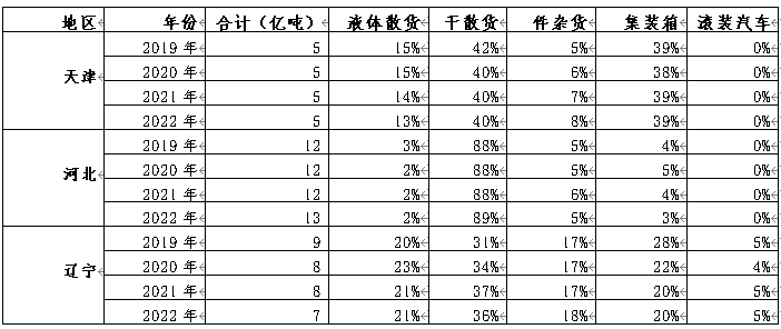 煤炭、矿石、油气、建材分别占总量的比例大约为18%、19%、9%、19%,合计大约占总量的65%,是中国港口主要的干散、液货。不同货物近年占比见下表所示。