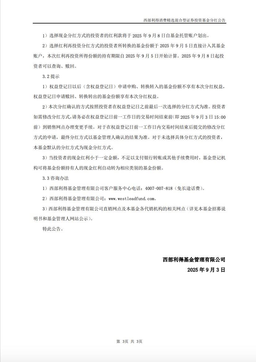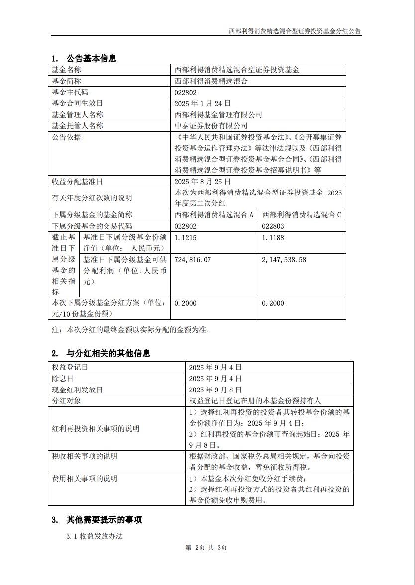 《西部利得消费精选混合型证券投资基金分红公告》,具体如下:
