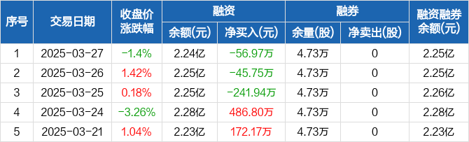 融资方面,当日融资买入807.46万元,融资偿还864.43万元,融资净偿还56.97万元,连续3日净偿还累计344.67万元。融券方面,融券卖出0股,融券偿还0股,融券余量4.73万股,融券余额26.72万元。融资融券余额合计2.25亿元。