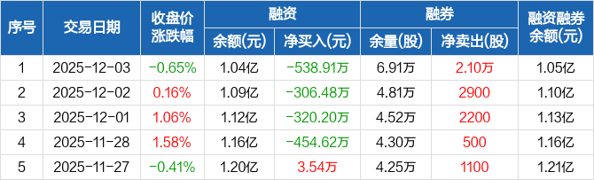 融资方面,当日融资买入635.36万元,融资偿还1174.27万元,融资净偿还538.91万元,连续4日净偿还累计1620.22万元。融券方面,融券卖出2.14万股,融券偿还400股,融券余量6.91万股,融券余额84.92万元。融资融券余额合计1.05亿元。