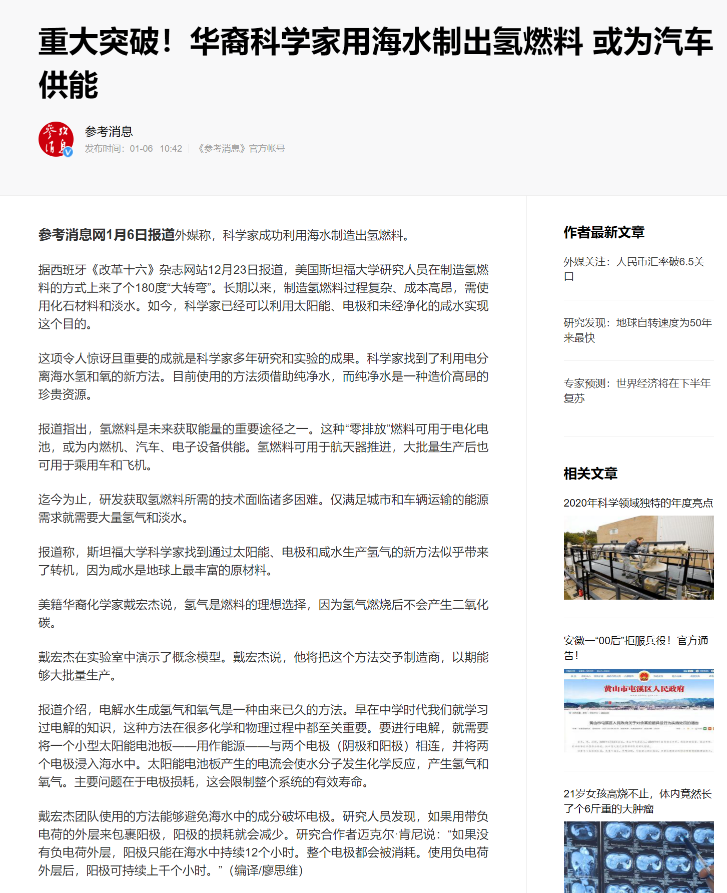重大突破!华裔科学家用海水制出氢燃料 或为汽车供能