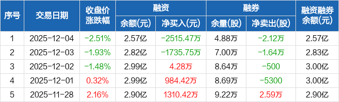融资方面,当日融资买入2110.42万元,融资偿还4625.9万元,融资净偿还2515.47万元。融券方面,融券卖出5000股,融券偿还2.62万股,融券余量4.88万股,融券余额43.63万元。融资融券余额合计2.57亿元。