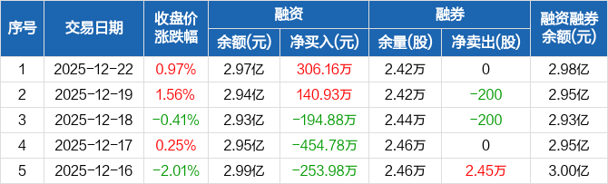 融资方面,当日融资买入761.04万元,融资偿还454.88万元,融资净买入306.16万元。融券方面,融券卖出0股,融券偿还0股,融券余量2.42万股,融券余额30.25万元。融资融券余额合计2.98亿元。