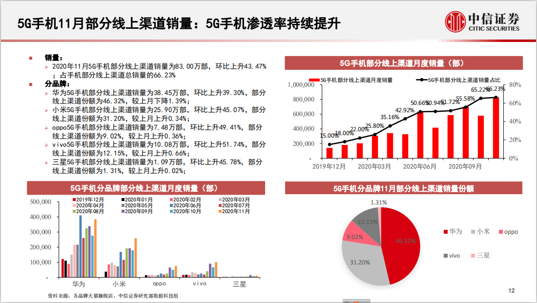 5G手机渗透率持续上升,11月以来手机销量增长明显