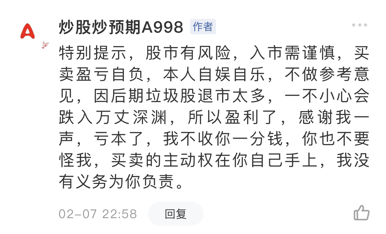请勿相信代客理财、免费荐股和炒股培训等宣传内容,远离非法证券活动。请勿添加发言用户的手机号码、公众号、微博、微信及QQ等信息,谨防上当受骗!