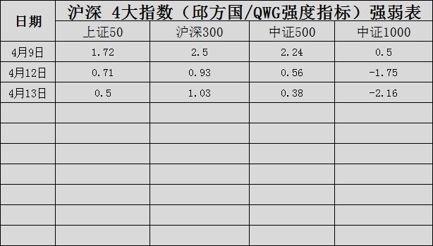 沪深 四大指数强弱表(4/13)