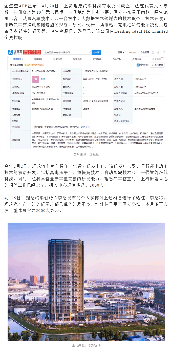 理想汽车研发总部落户上海嘉定 将于4月底入驻