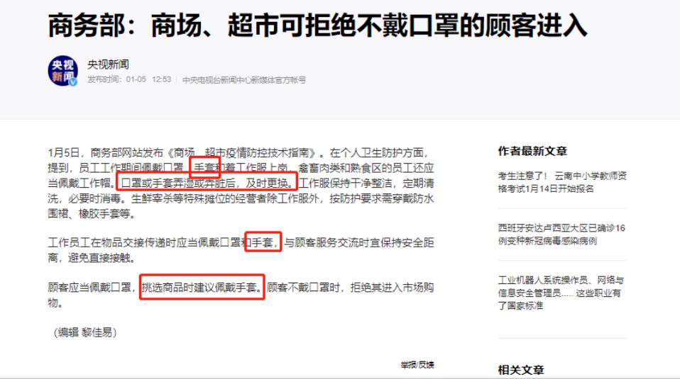 商务部;商场.超市可寸拒绝不戴口罩的顾客进入