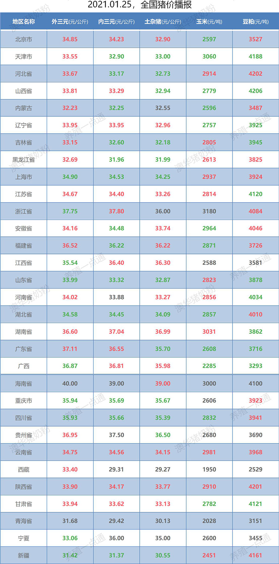 2021.01.25,全国生猪价格播报