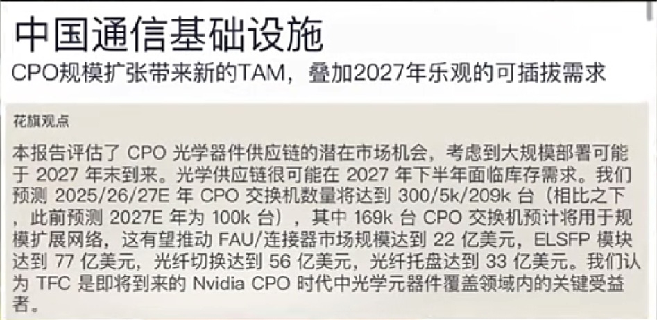 $天孚通信(SZ300394)$ 估计下午就要拉起来了,根据花旗最新预测,CPO交换机在2025/2026/2027年分别出货300/5000/20.9万台,花旗认为TFC将是即将到来的英伟达CPO时代光器件领域关键受益者。