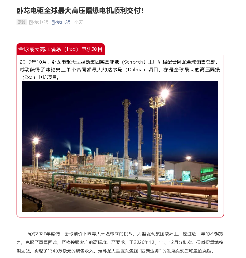 卧龙电驱全球最大高压隔爆电机顺利交付