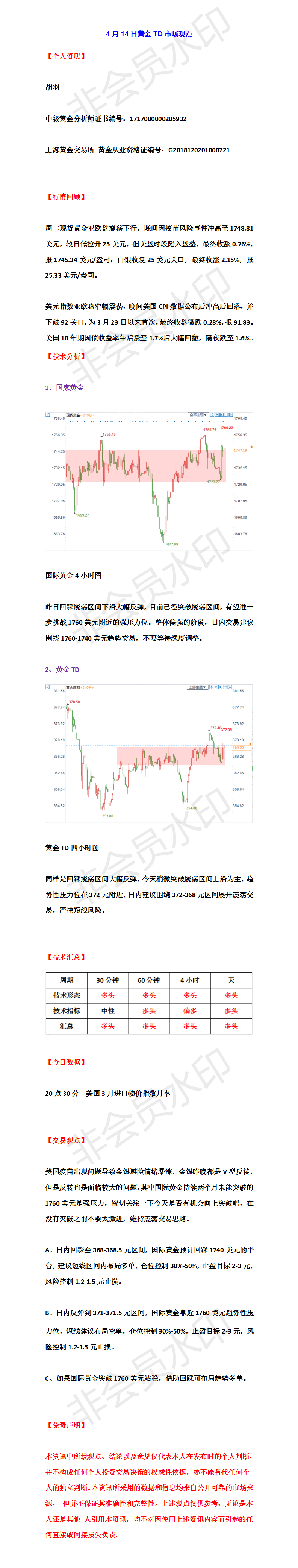 【策金台】4月14日黄金TD市场观点