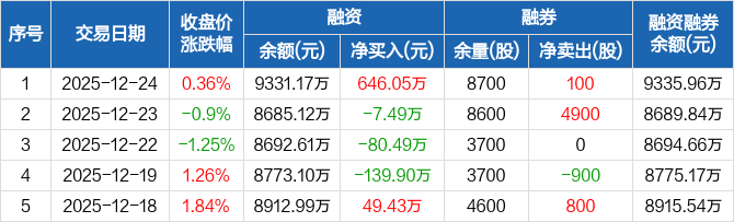 融资方面,当日融资买入797.53万元,融资偿还151.48万元,融资净买入646.05万元。融券方面,融券卖出1200股,融券偿还1100股,融券余量8700股,融券余额4.79万元。融资融券余额合计9335.96万元。
