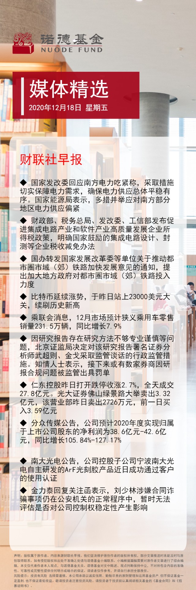 诺德基金媒体精选:一图掌握市场要闻(2020.12.18)