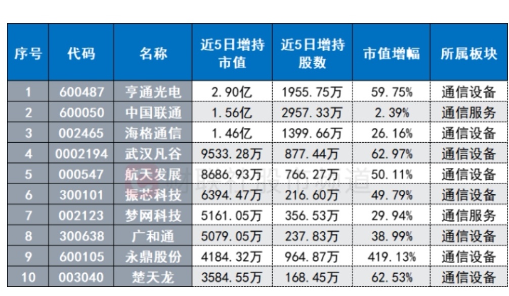 筛选通信行业相关个股,以近5日(3月17日至23日)数据统计,共有8只通信概念股获北向增持超5000万元,其中,亨通光电、中国联通、海格通信增持市值规模均在亿元以上,分别录得2.9亿元、