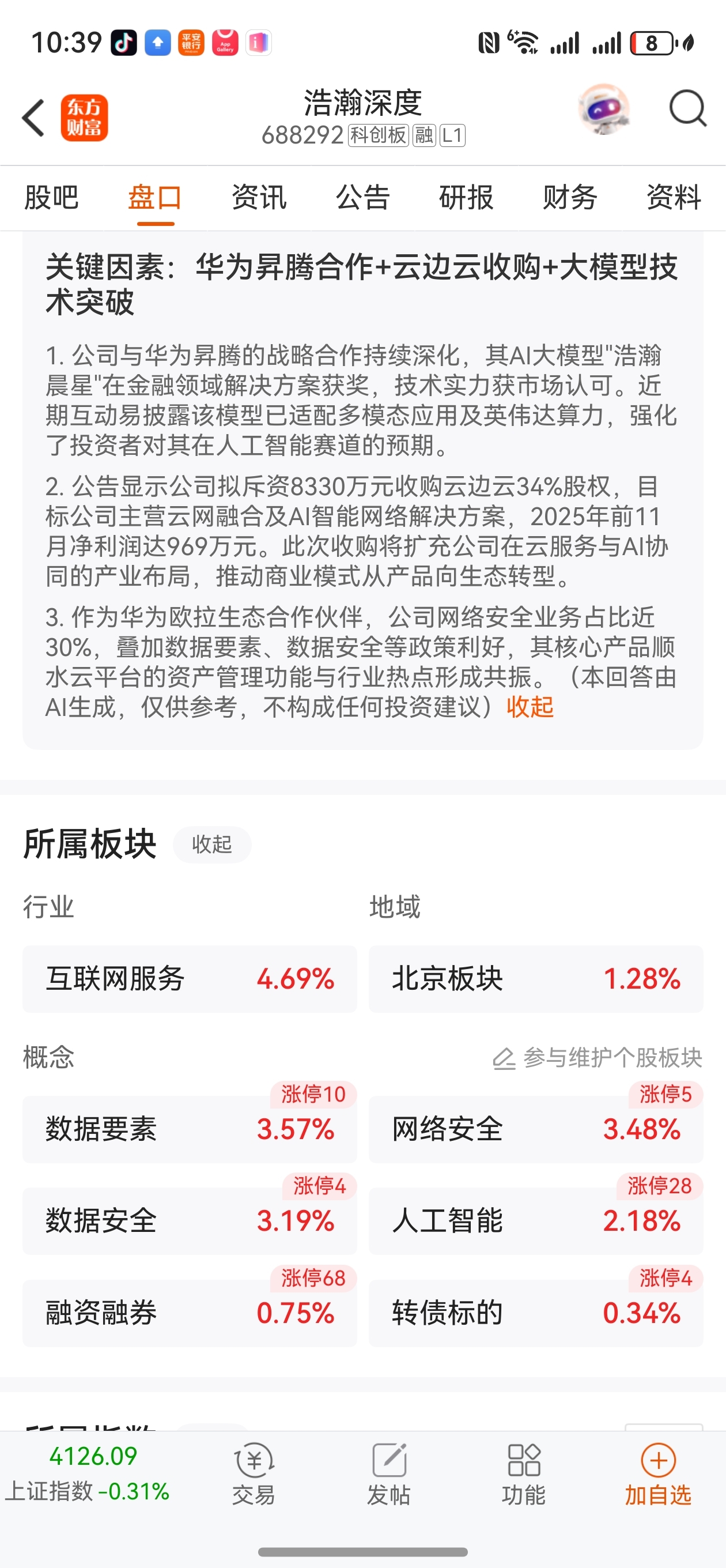 $浩瀚深度(SH688292)$ AI华为深度合作+云边云收购+大模型技术突破+网络数据安全北京