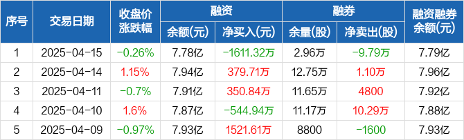 融资方面,当日融资买入1114.06万元,融资偿还2725.38万元,融资净偿还1611.32万元。融券方面,融券卖出0股,融券偿还9.79万股,融券余量2.96万股,融券余额33.86万元。融资融券余额合计7.79亿元。