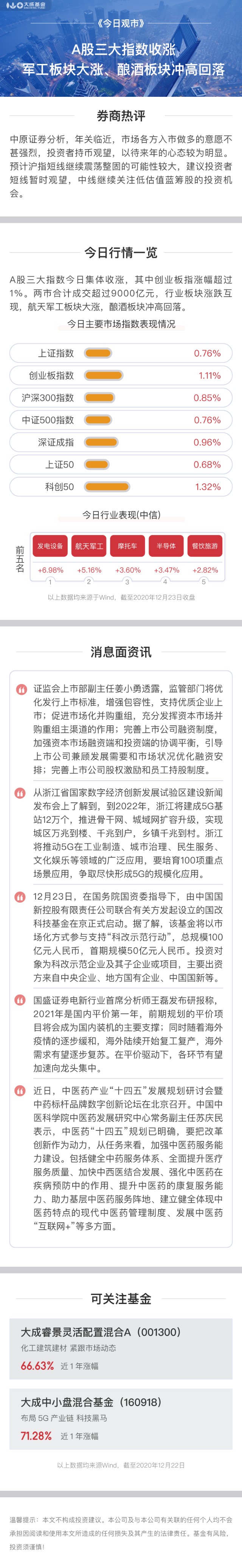 今日收评三大指数收涨 军工板块大涨、酿酒板块冲高回落