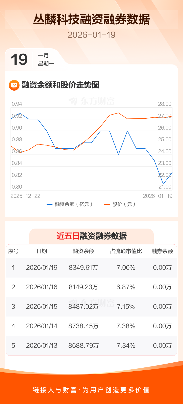 交易所最新数据显示,丛麟科技于2026年1月19日获融资买入649.80万元,融资偿还449.41万元,当日融资净买入200.38万元。目前,该股融资余额8349.61万,占流通市值比例为7.00%。