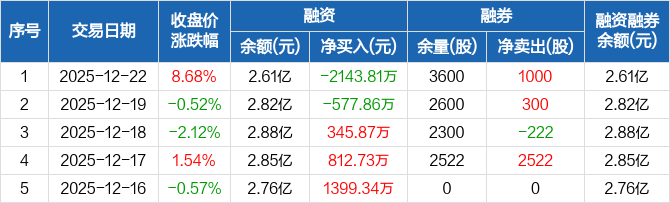 龙迅股份融资融券信息显示,2025年12月22日融资净偿还2143.81万元;融资余额2.61亿元,较前一日下降7.6%。