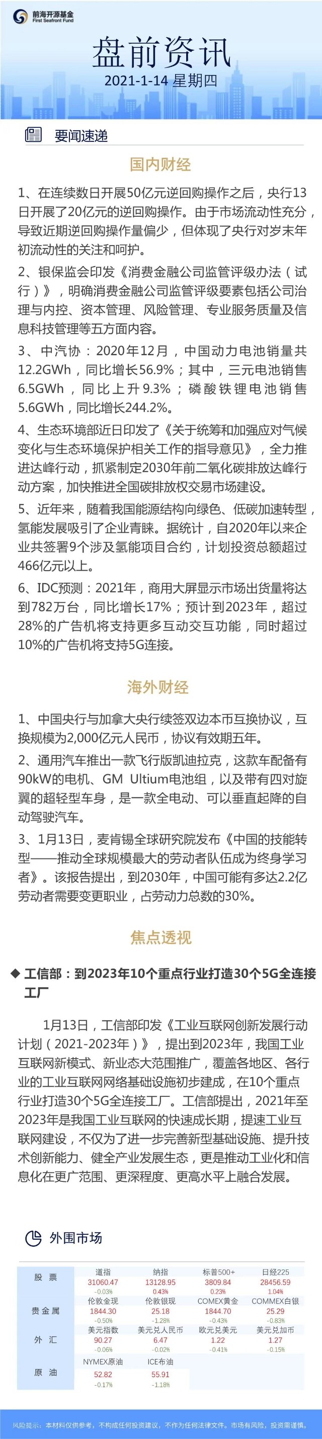 【盘前资讯】到2023年10个重点行业打造30个5G全连接工厂