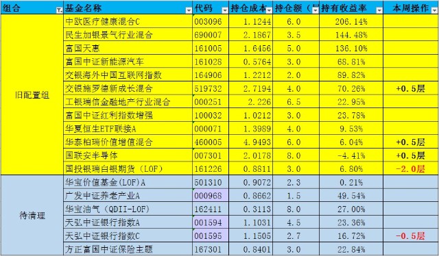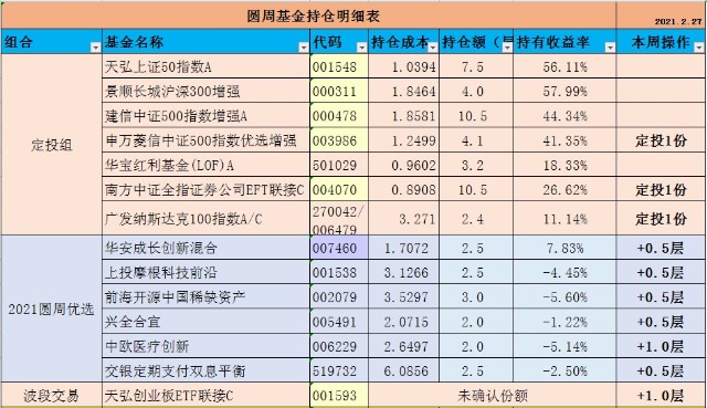 1、本周对今年的新组合(2021圆周优选)基金全面加仓,但总的幅度不大。除了中欧医疗创新是加了1层外,其余均是0.5层小幅补仓,截至当前,该组合基金仓位均位于2-3层之间,总仓位属于轻仓,对后市的诸多不确定性因素留有不少仓位,可以从容应对。