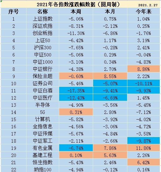 上图是本周主要指数的涨跌数据。其中,上证指数下跌5.06%,深证成指下跌8.31%,创业板指下跌11.3%,中证全指下跌6.02%,中证500下跌5.06%,沪深300下跌7.65%。