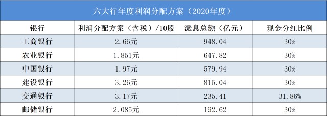 具体来看,交通银行最“大方”,其现金分红比例达到31.86%,其余五大行的比例均为30%。