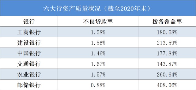 资产质量方面,截至2020年末,六大行不良贷款率均较上年末有所上升,工商银行、建设银行、农业银行、交通银行不良贷款率均上升超过0.1个百分点。