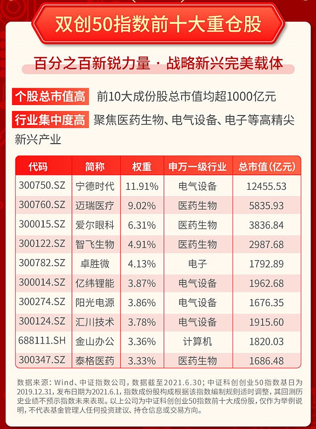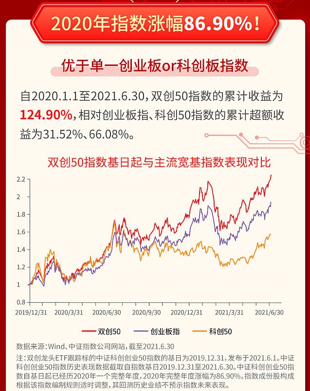 科创创业50指数(简称双创50指数)从“科创板+创业板”中选取市值较大的50只战略新兴产业上市公司股票组成成份股,100%投资战略新兴产业,自基日(2019.12.31)至2021.6.30,双创50指数累计收益达124.90%!