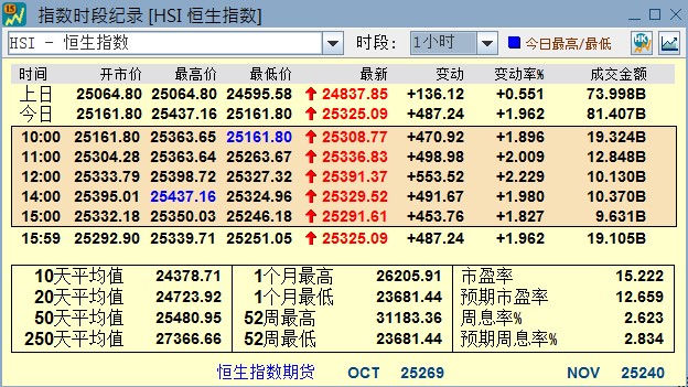 恒指(HSI)收报25325.09点,上升 1.96%。恒指全日波幅约 1.09%,对比10月8日,恒指波幅有所减少。恒指最近一个月的波幅维持在23681至26206点;恒指月内下跌约 3.78%。恒指成份股占大市成交49.97%。窝轮市场占大市成交约 6.73%,牛熊证市场占大市成交大概4.28%。