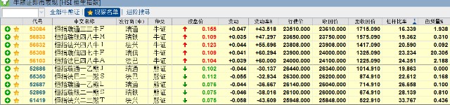 恒指牛证收回价位于24040-24240,到期日1个月以上的产品有23只,实际杠杆22.2-26.4倍;较高杠杆的有57583及55633。熊证收回价位于26410-26610,到期日1个月以上的产品有32只,实际杠杆16.2-19.2倍;较高杠杆的有69428及54737。