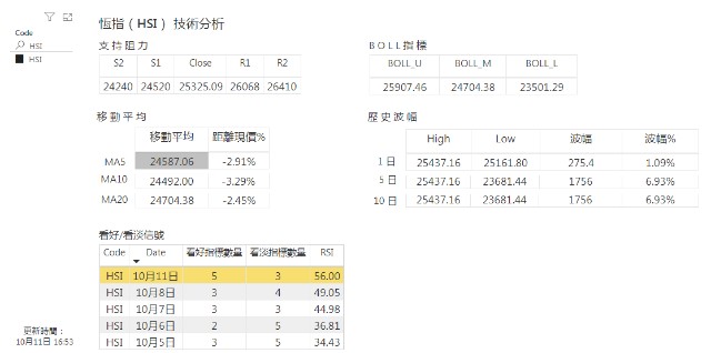 预计恒指(HSI)即日波幅约3.7%。恒指第一个阻力位:26068点,升穿概率6%;第一个支持位位于24520点,跌穿概率15%。