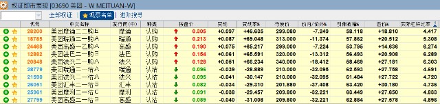 美团牛证收回价位于234.9-244.9,到期日1个月以上的产品有9只,实际杠杆6-6倍;较高杠杆的有56705及59829。熊证收回价位于309.8-319.8,到期日1个月以上的产品有8只,实际杠杆6.1-7.5倍;较高杠杆的有66759及62880。