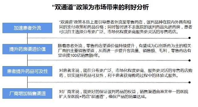 近年来,国家政策一直就在助推院外市场的持续发展,尤其是今年6月份正式出台的“双通道”政策,国家将定点零售药店也纳入了谈判药品供应的保障范围。