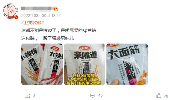 甚至卫龙近一年引发重大舆情的是去年3月份的翻车事件——有网友吐槽卫龙部分包装上的用词过于露骨,营销低俗,是在打色情擦边球。
