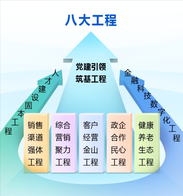 所谓八大工程,包括党建引领筑基工程、人才建设固本工程、销售渠道强体工程、综合营销聚力工程、客户经营金山工程、政企合作民心工程、健康养老生态工程、金融科技数字化工程。