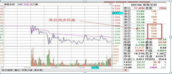 庄家出货时在卖盘上是不会挂大卖单的,下方买单反而大,显示委比很大。这又会散户造成了一种假象,让散户觉得买盘很多,但上方某价位却有吃不完的货,或成交明细中常有大卖单卖出,而买单却很弱,导致价格下沉,无法上行。
