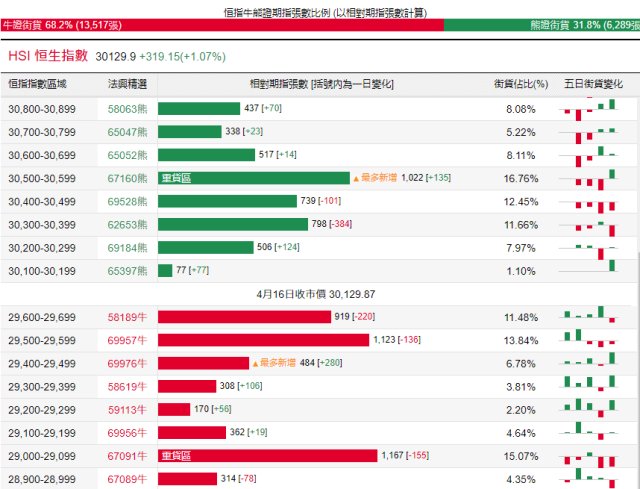 街货分布方面,截至周二,恒指牛证街主要分布在收回价29000点至29700点之间,累积相当约4533张期指合约;恒指熊证街货分布比较进取,收回价分布在30100点至30600点之间,累计相当约3142张期指合约。