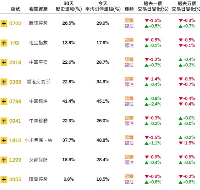 恒指波幅指数(VHSI)周二收盘报15.35,下跌4.36%。腾讯、中国平安、香港交易所等个股认购证引伸波幅单日录得下跌,其认沽证引伸波幅则录得上涨,中国铁塔个股认购证与认沽证单日录得上涨。