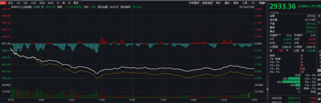 沪深两市全天单边走低,上证综指收跌2.58%报2933.36点,失守20日线;深证成指跌2.72%报9186.29点;创业板指2.65%,一度失守1500点。两市成交4682亿元,较上交易日放量逾900亿元。