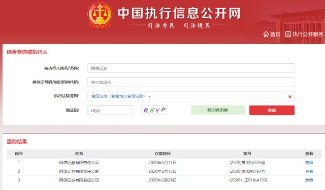 中国执行信息公开网显示,今年以来网信证券已有3笔被执行信息,立案时间为2020年2月-5月,执行标的分别为4717.31万元、1.93亿元和3909.63万元。
