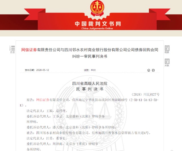 日前,中国裁判文书网披露的一份网信证券与邻水农商行的债券回购合同纠纷判决书,透露了网信证券追债的窘境:1.3亿元的债券购买价款不仅未获支持,还要倒贴73万的案件受理费。