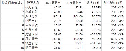 做了个化工板块市值排名,10大化工股有9只在今天创出今年新低。化工还不走稳,止。