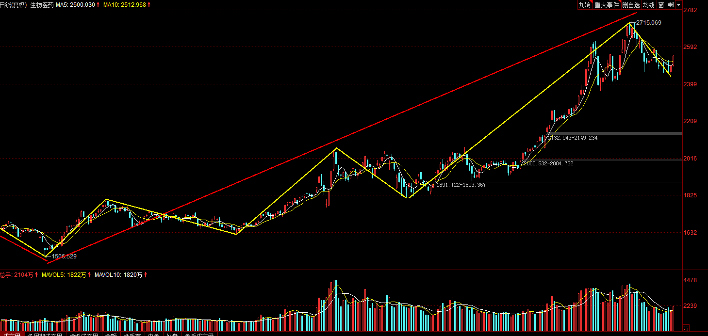 反弹突破了b的高点,所以至少可以判断下跌段2结束了,将要运行一个上涨段,接着若突破下跌段2的高点,那么新的日线级别的上涨就正式开始了。医药板块是趋势性主线品种,可重点关注。