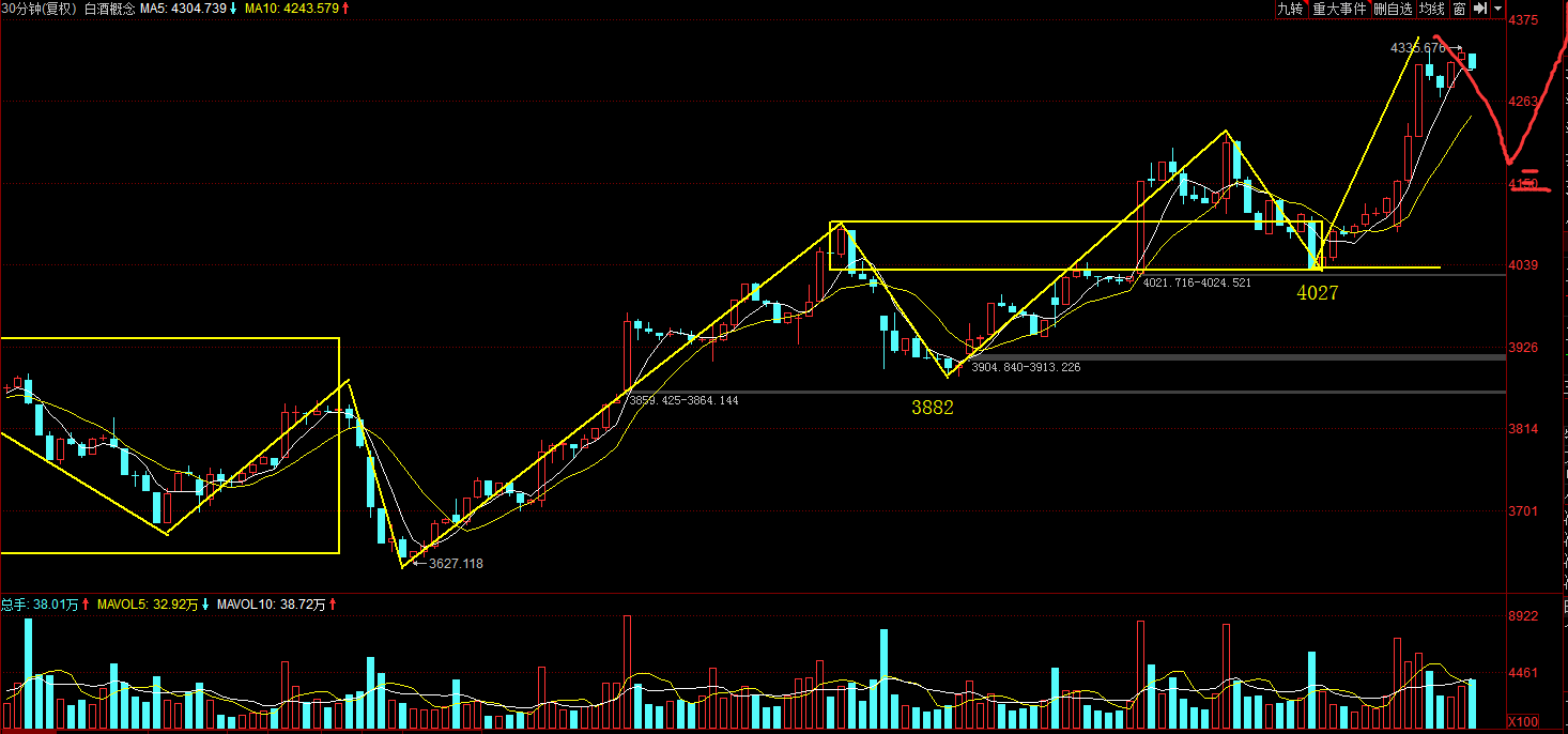 那么如何来守住这种繁华,看30分钟级别,以中枢下沿4027点为防守线,,只要不跌破这个点,就继续持有,跌破出局。简单明了。对于我们跟踪的个股今世缘也是一样,今天就不贴图了。