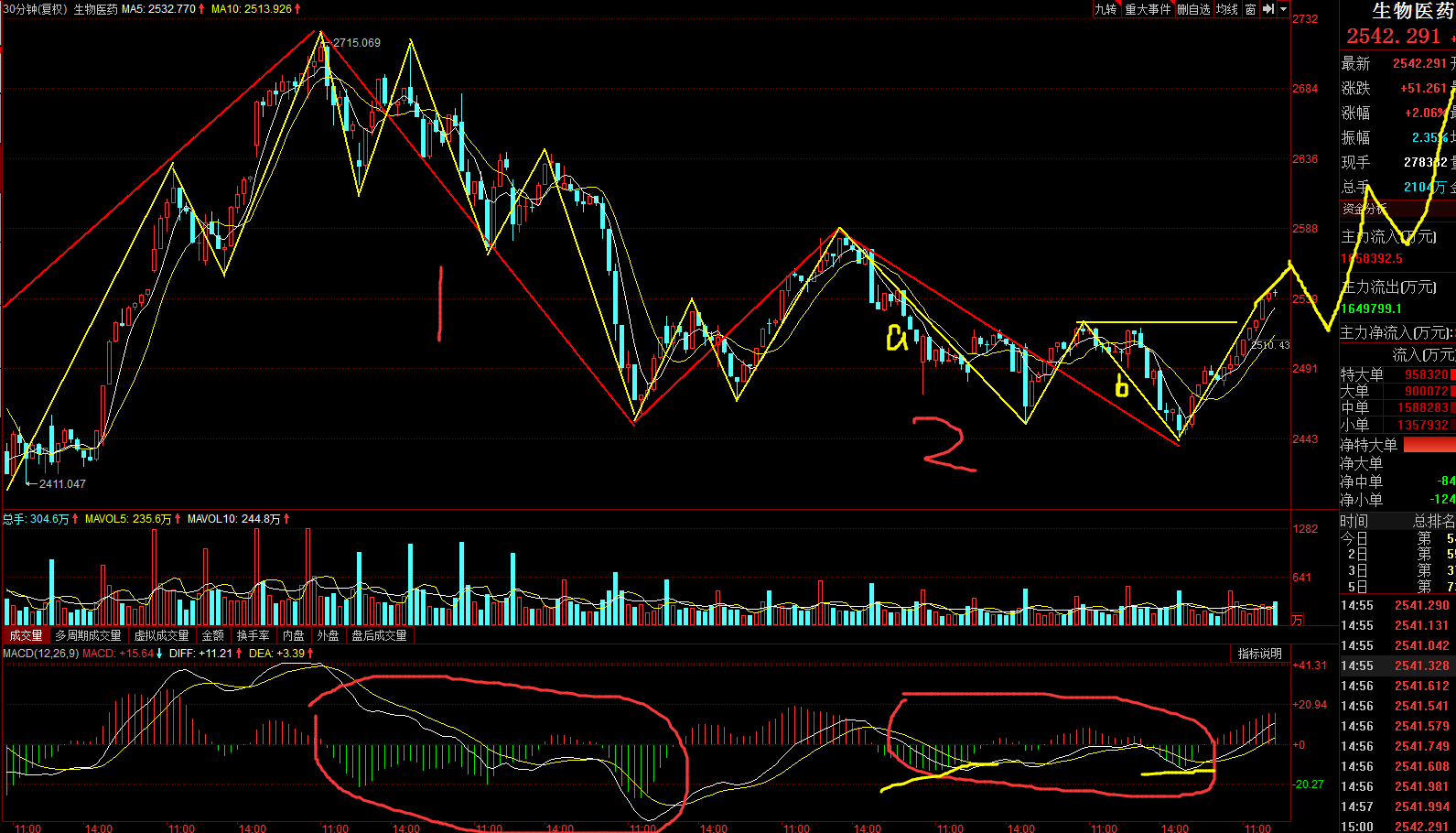 下图是生物医药板块的30分钟图,图中红色标注的是段,很明显,2段的下跌力度比1段小,出现背驰,再看2段的内部结构,b相对与a的下跌也出现背驰,双重背驰引发了这波反弹。