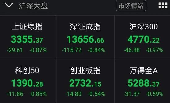 截至收盘,上证指数跌0.87%,报3355.37点;深证成指跌0.84%,报13656.66点;创业板指跌0.54%,报2732.15点。