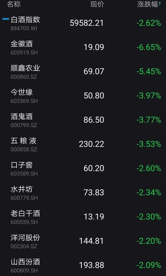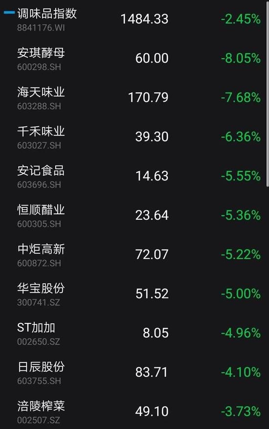 消费品龙头股集体受挫。截至收盘,海天味业(170.790, -14.21, -7.68%)大跌7.68%,恒顺醋业(23.640, -1.34, -5.36%)大跌5.36%,今世缘(50.800, -2.10, -3.97%)、酒鬼酒(86.500, -3.39, -3.77%)、五粮液(230.220, -8.42, -3.53%)跌幅均超过3%。